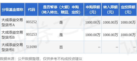 本站消息,6月16日大成基金管理有限公司发布《关于大成添益交易型货币市场基金A类份额及B类份额调整个人投资者大额申购(含定期定额申购)及转换转入业务的公告》。公告中提示,为满足广大投资者的投资需求集采优配,自2025年6月17日起大成添益交易型货币市场基金A类份额及B类份额调整个人投资者大额申购(含定期定额申购)及转换转入业务,申购、转换转入上限金额为1000.0万元,下属分级基金调整明细如下: