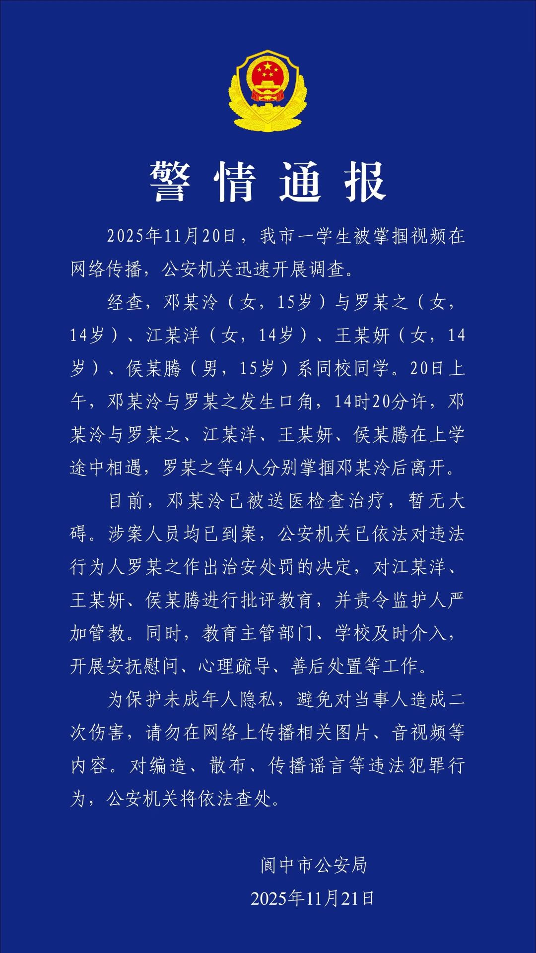 11月20日,阆中市一学生被掌掴视频在网络传播,公安机关迅速开展调查。